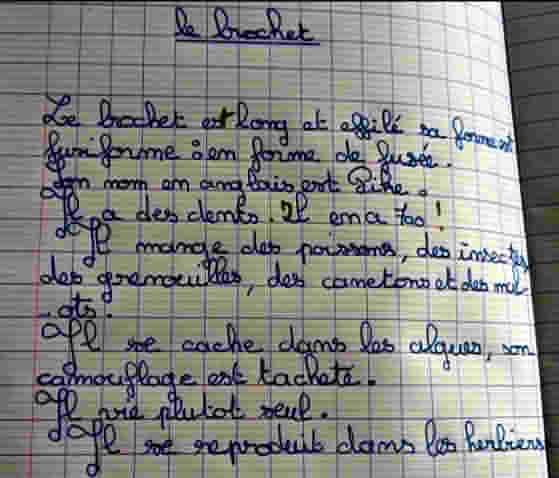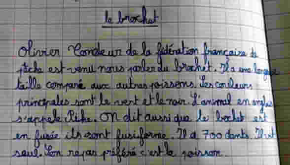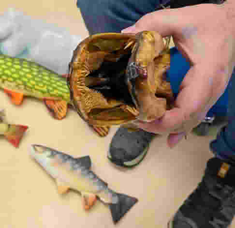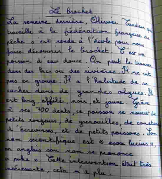 Les enfants se sont montrés très intéressés. Les élèves ont ensuite été très impressionnés par la vraie tête de brochet que l’animateur a sortie de son sac : le brochet est l’animal qui a le plus de dents ! Il en a sur ses mâchoires mais aussi sur sa langue et dans sa gorge !